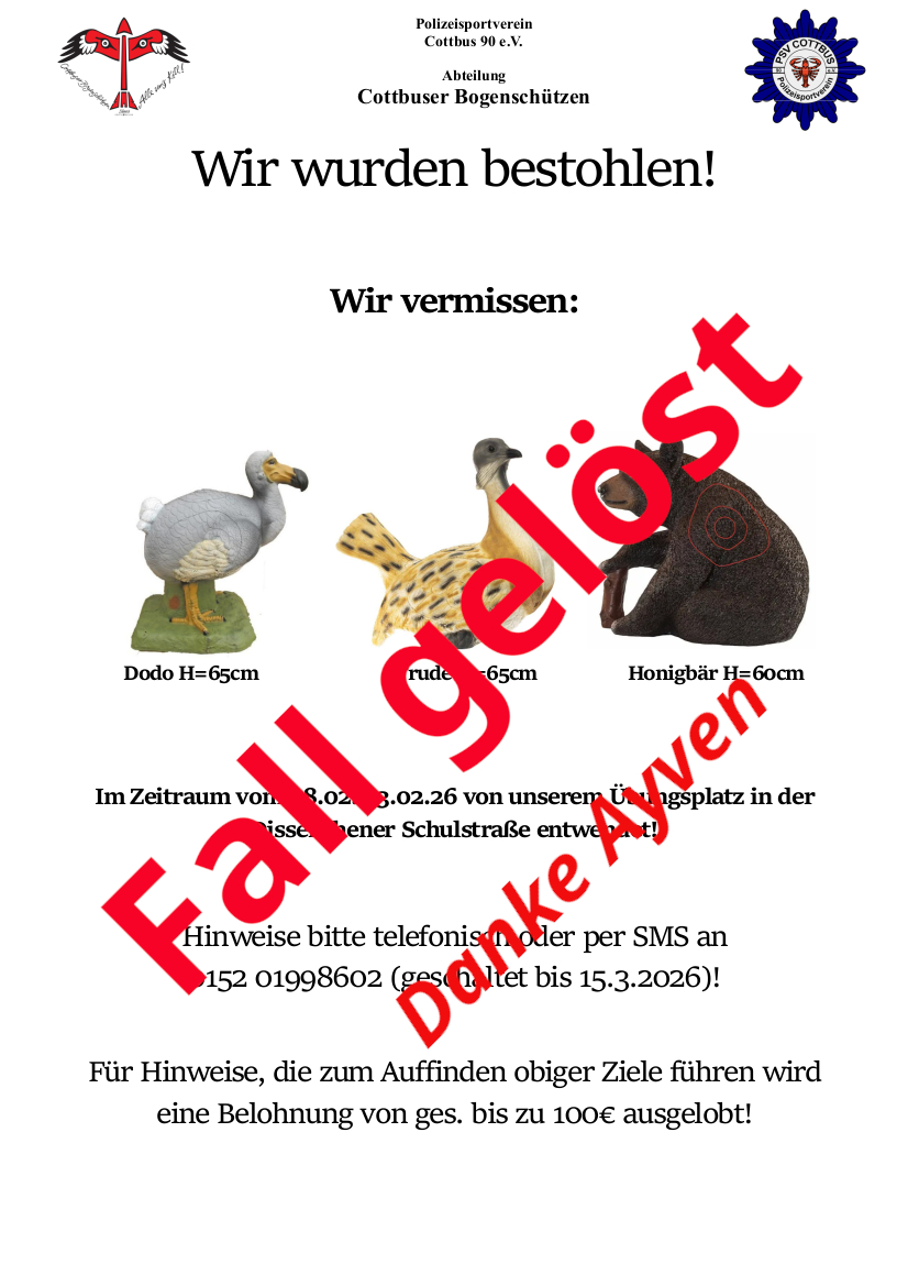 Der „Finder“ unserer gestohlenen 3D- Ziele, nach denen wir mit einer improvisierten öffentlichen „Vermisstenanzeige“ in Dissenchen und Merzdorf mit Wurfzetteln in Briefkästen, Aushängen an 3 Bushaltestellen und auf unserer Webseite um Hinweise zum Wiederauffinden gebeten hatten, konnte an diesem Tag mit Ehre und Anerkennung gewürdigt werden. Ayven hatte beim Joggen eines unserer vermissten Ziele gesehen und unserer Suchaktion zuordnen können. Im „Vorbeigehen“ könnte man meinen. Dann zum Telefon gegriffen, uns verständigt und am Folgetag zum Fundort geleitet, an dem dann alle drei Ziele aufgefunden werden konnten. Vielleicht hatten die Diebe kalte Füße bekommen und sie dort „entsorgt“.